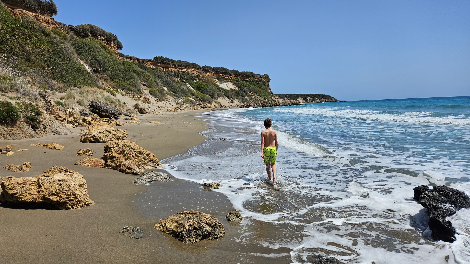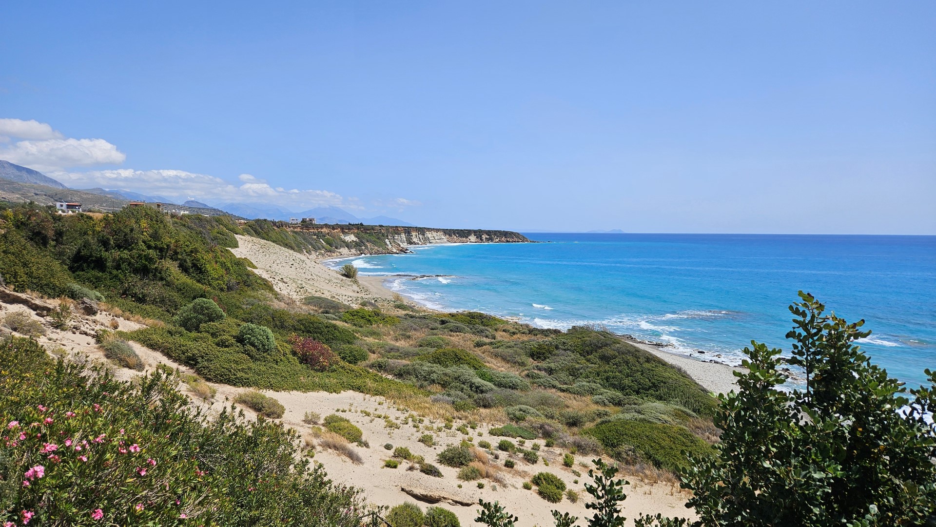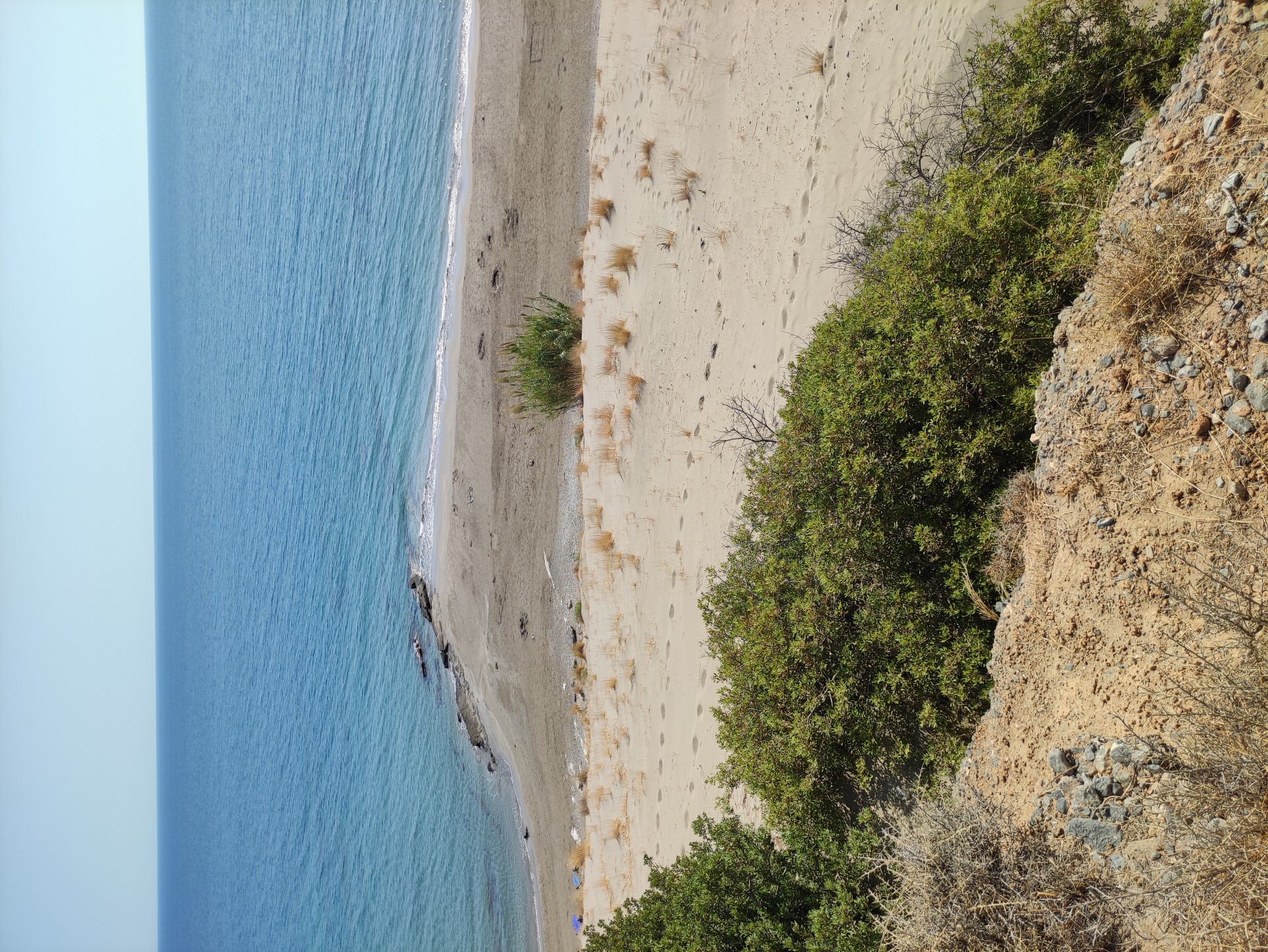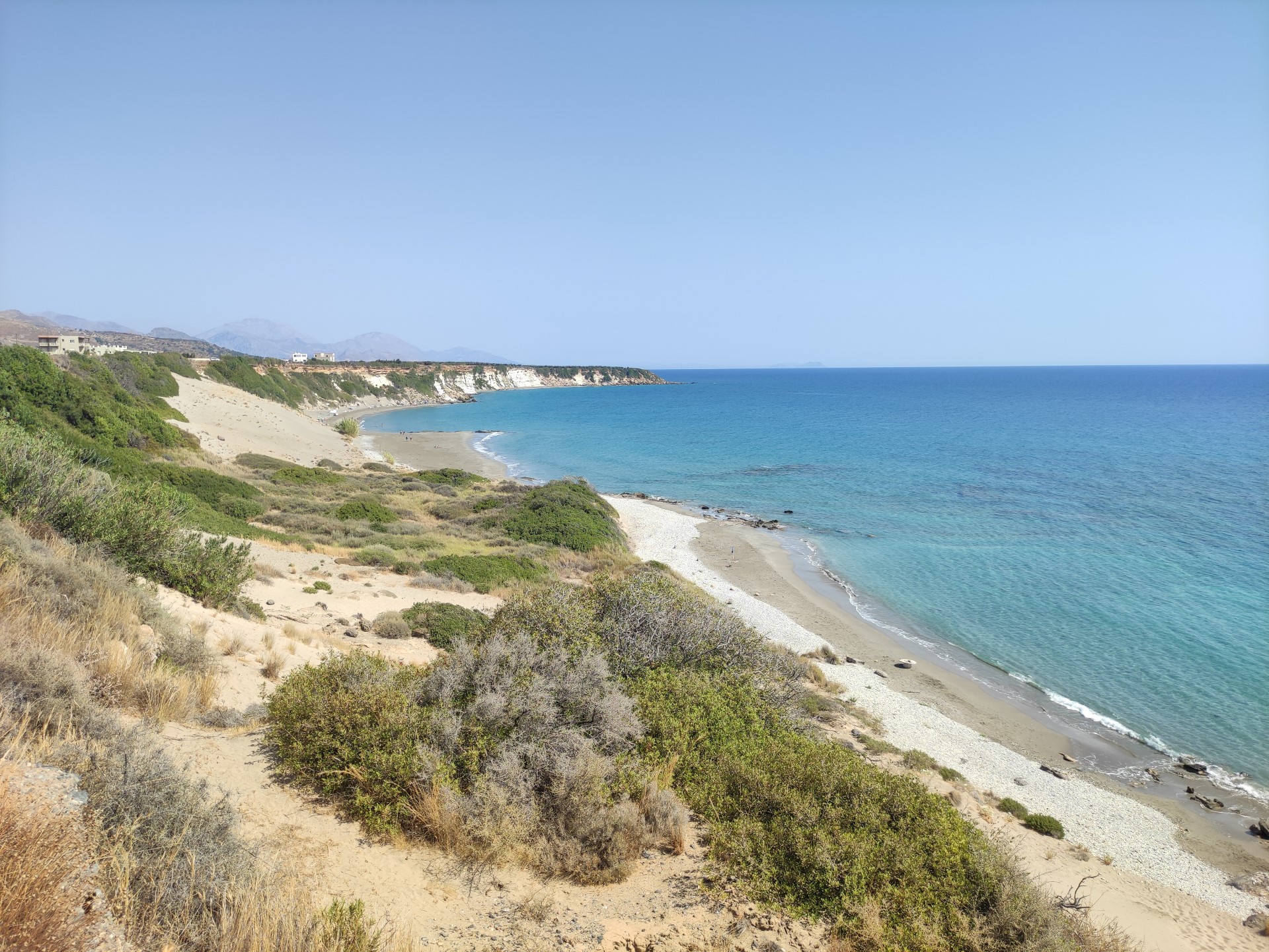 The beach is quiet, in comparison to Frangokastelo that is directly next to it. However, there are a very few accommodation and food amenities, but no sunbeds and water sport services. It's easternmost part is called Kritama and is characterized by high cliffs and turquise water.