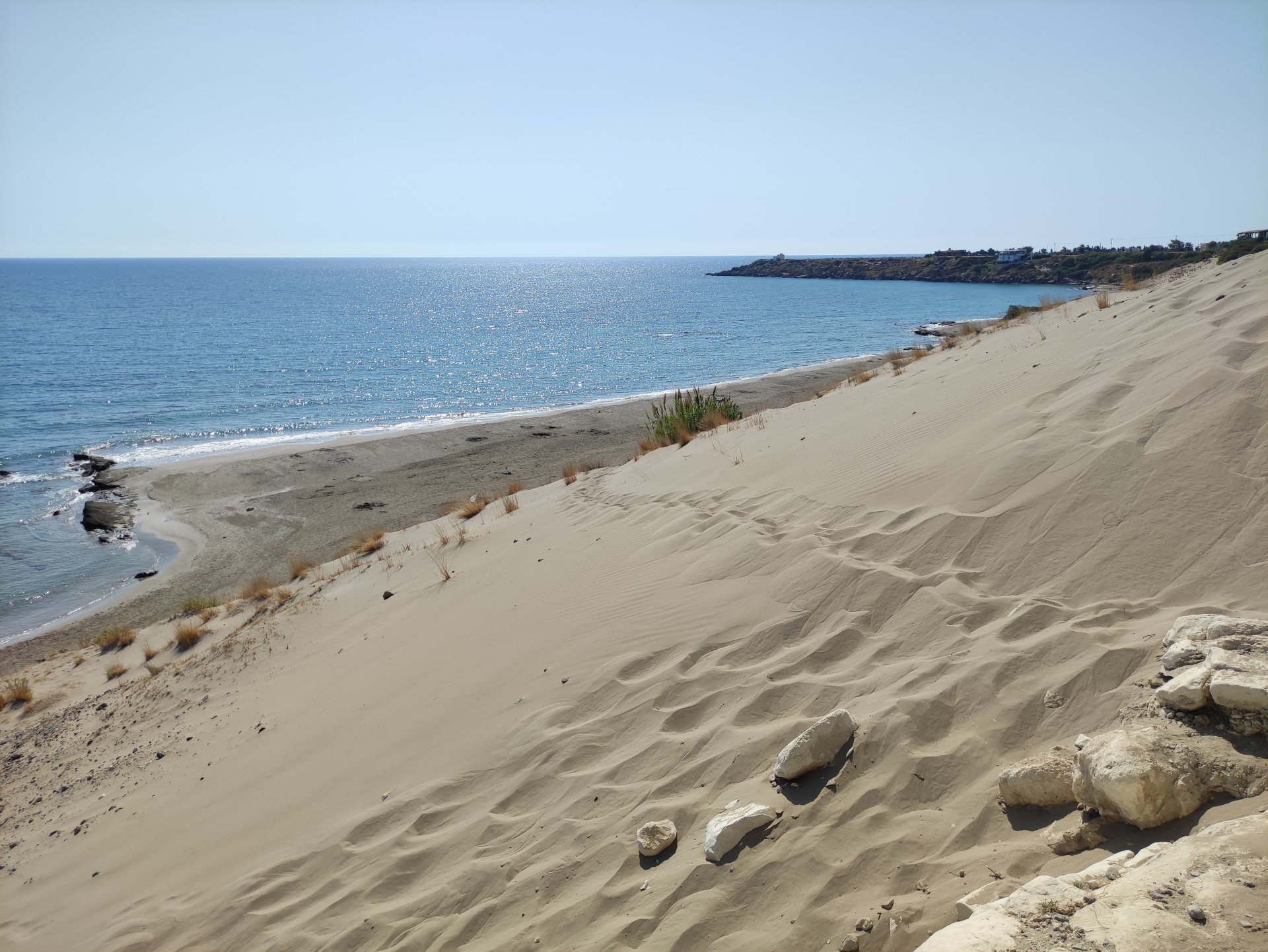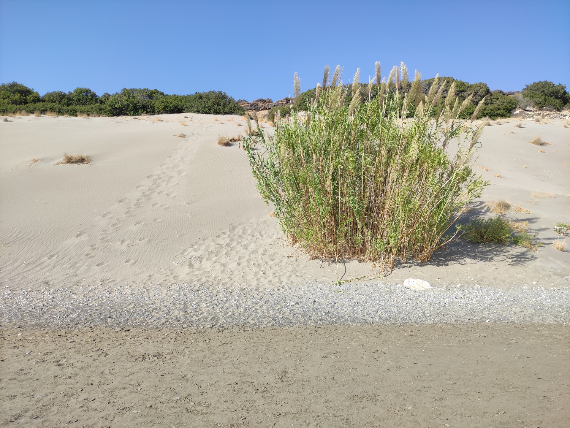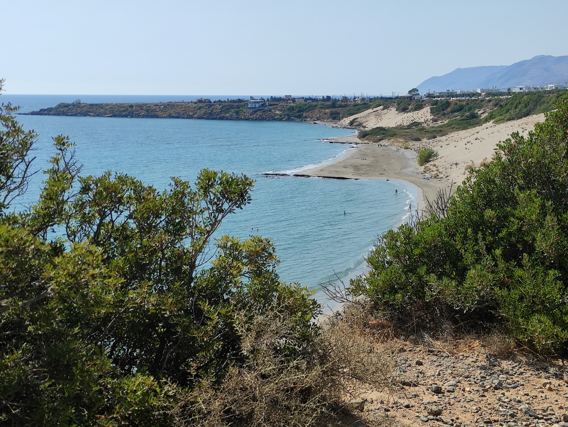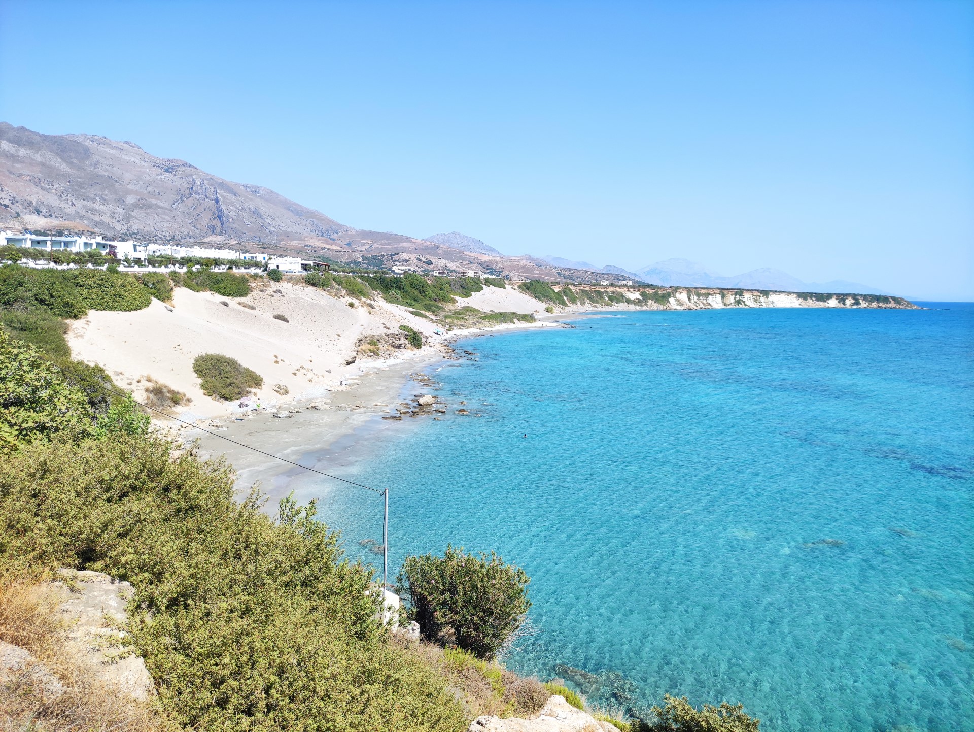 It is famous for the big sand hills and dunes that have been shaped and the crystal clear waters. The beach is affected by south winds, but not too much. The east part of the beach is traditionally occupied by nudists, but their number is decreasing in the last years. You can access the beach by either walking 10' from Frangokastelo or park above the sand hills. Note that sand is very hot when descending to the beach!